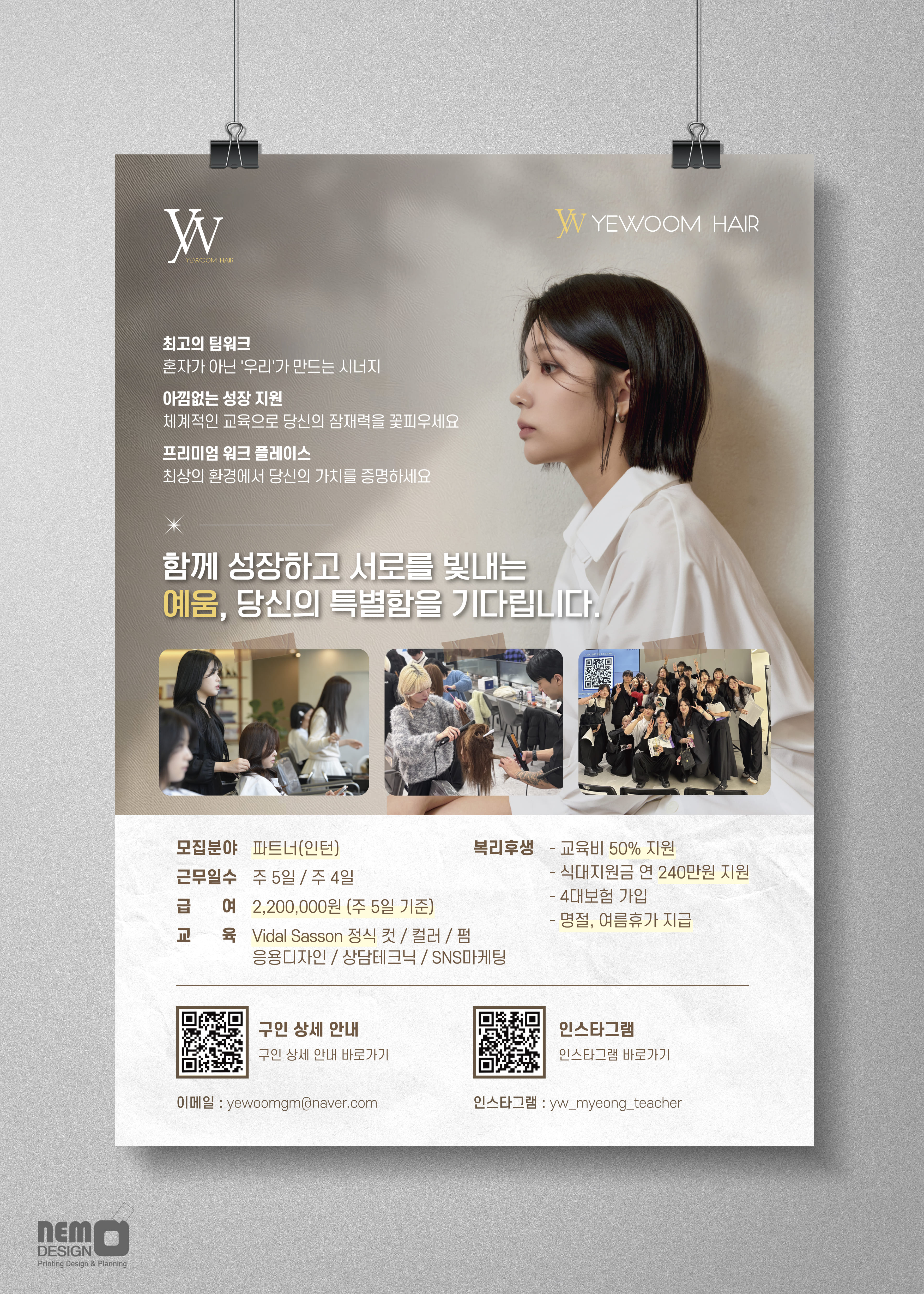 예움헤어 포스터 본 블로그의 모든 이미지의 사용 저작권은 네모디자인 www.nemodesign.net 에 있습니다.사전 동의 없이 무단 복제 및 사용을 금지합니다. 항상 최고의 디자인만을 고집하는 네모디자인입니다.네모 디자인 홈페이지에서 접수를 도와드릴수 있습니다.^^www.nemodesign.net 상담문의 031-754-6293 NEMO PORTFOLIO/포스터&POP 2025.08.08